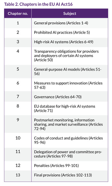 Chapter 3 of the EU AI Act defines high-risk AI systems, particularly those integrated into medical devices subject to third-party conformity assessment under the EU MDR, requiring comprehensive risk management, data governance, human oversight, and technical documentation throughout the AI system's lifecycle. Chapter 4 emphasizes transparency requirements, including informing users that they are interacting with an AI system, labeling synthetic content, and providing explanations for AI-driven outputs. Chapters 7, 8, and 9 further complement this framework by covering general-purpose AI governance, postmarket monitoring, and enforcement mechanisms. Together, these chapters support continuous oversight, accountability, and alignment with EU-wide regulatory standards, particularly for medical device applications where AI may influence patient safety and clinical decision-making. For additional information on the specific chapters, refer to the EU AI Act.16 Table 2 outlines the subject of each chapter in the EU AI Act.