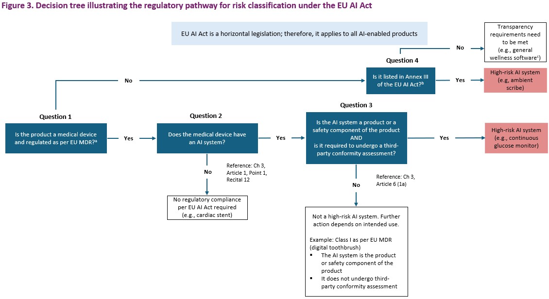 If the product in question is not a medical device (No to Question 1), the pathway proceeds to Question 4 (the decision pathway for Question 4 is elucidated in a later section). If it is a medical device (Yes to Question 1), the pathway advances to Question 2, which asks whether the medical device has an AI system. The definition of an AI system is provided in Chapter 3, Article 1, Point 1, and Recital 12 of the EU AI Act.16 If no AI system is present, then the EU AI Act does not apply (No to Question 2). For example, a cardiac stent, which is classified as a Class III medical device under the EU MDR, is an implantable device with no AI systems in the product or as a safety component.