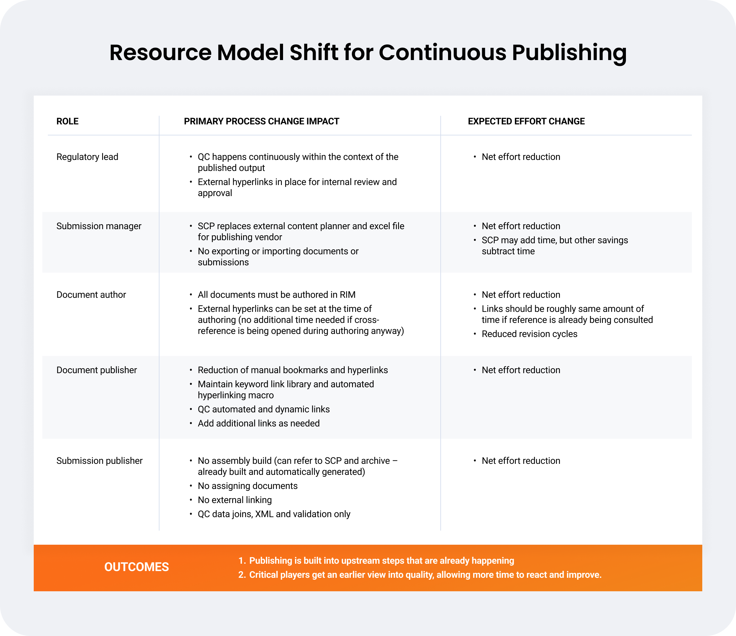 Regulatory teams usually have deep knowledge of regulatory requirements and complex processes that make up the submission preparation process. While moving to continuous publishing increases efficiency and eliminates rework, it does require a change to long-standing processes and mindsets.